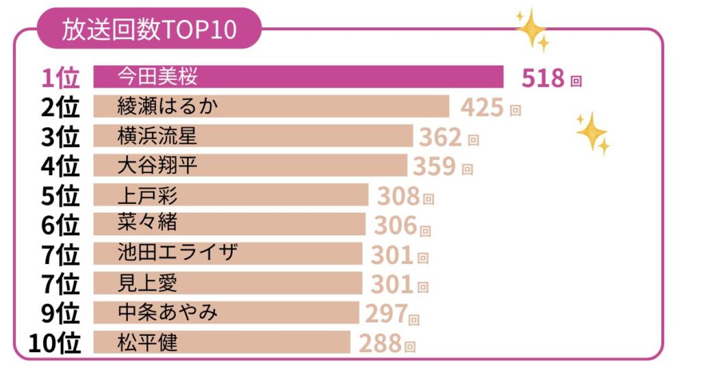 この記事では、上位タレントの順位を一覧で見やすくまとめつつ、「放送回数って何を数えてるの?」「ランキングの見方は?」といった疑問も一緒に解説します。