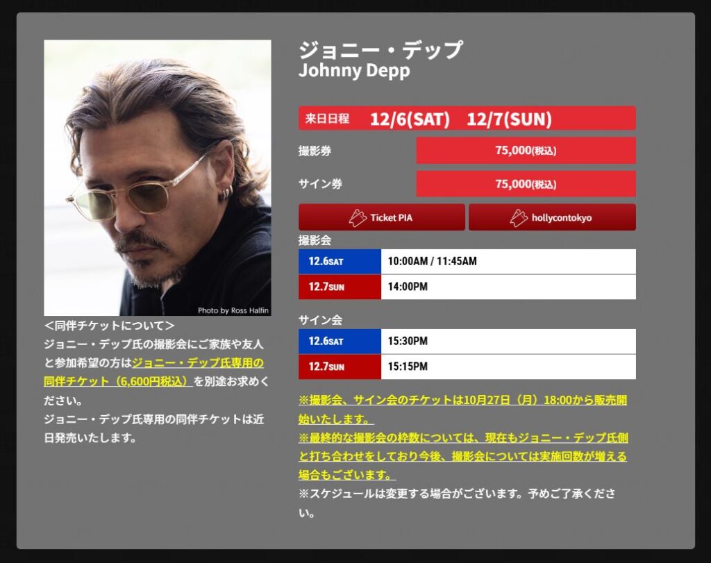 また、3日間通し券が9,900円、前売り1日入場券が5,500円といった一般入場券の価格と比べても、デップ氏のサイン会がどれほど特別な位置づけなのかが際立ちます。